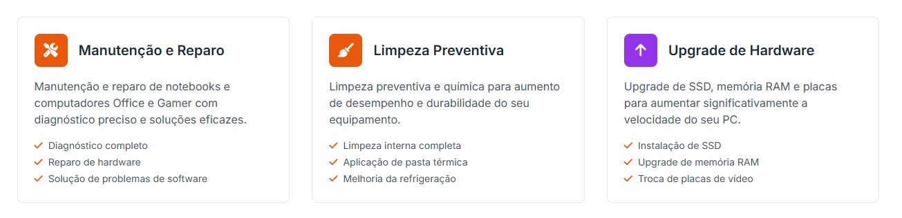 Manutenção e ReparoManutenção e reparo de notebooks e computadores Office e Gamer com diagnóstico preciso e soluções eficazes.